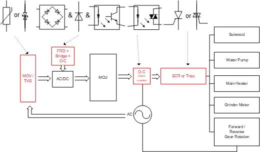 人们把电子技术应用到咖啡机上,实现了磨粉、压粉、装粉、冲泡、清除残渣等酿制咖啡全过程的自动控制,创造了全自动电子咖啡机。 应用于消费电子领域,CA88官网微电 能提供比较齐全的元件解决方案。比如:AC 输入端防浪涌的压敏电阻(MOV)、电源部分用快恢复二极管(FRD, fast recovery diode)及整流桥(Bridge)、光电隔离器件(Opto-coupler)、控制负载通断的可控硅(SCR & Triac)等。
