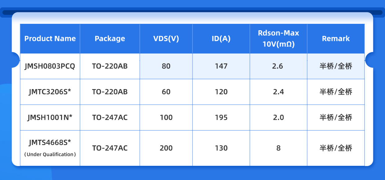 Rdson (典型值1.8mΩ, Max@10V 2.6mΩ),电流能力高达147A (TO-220AB封装)。60V 平台能手:JMTC3206S