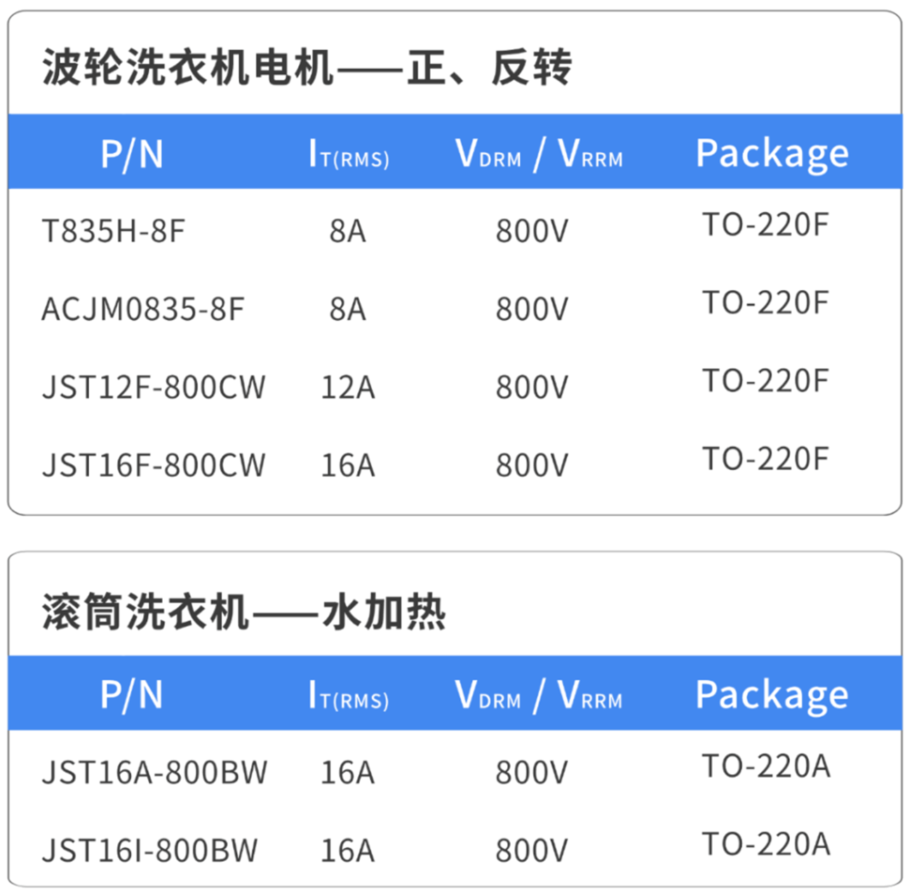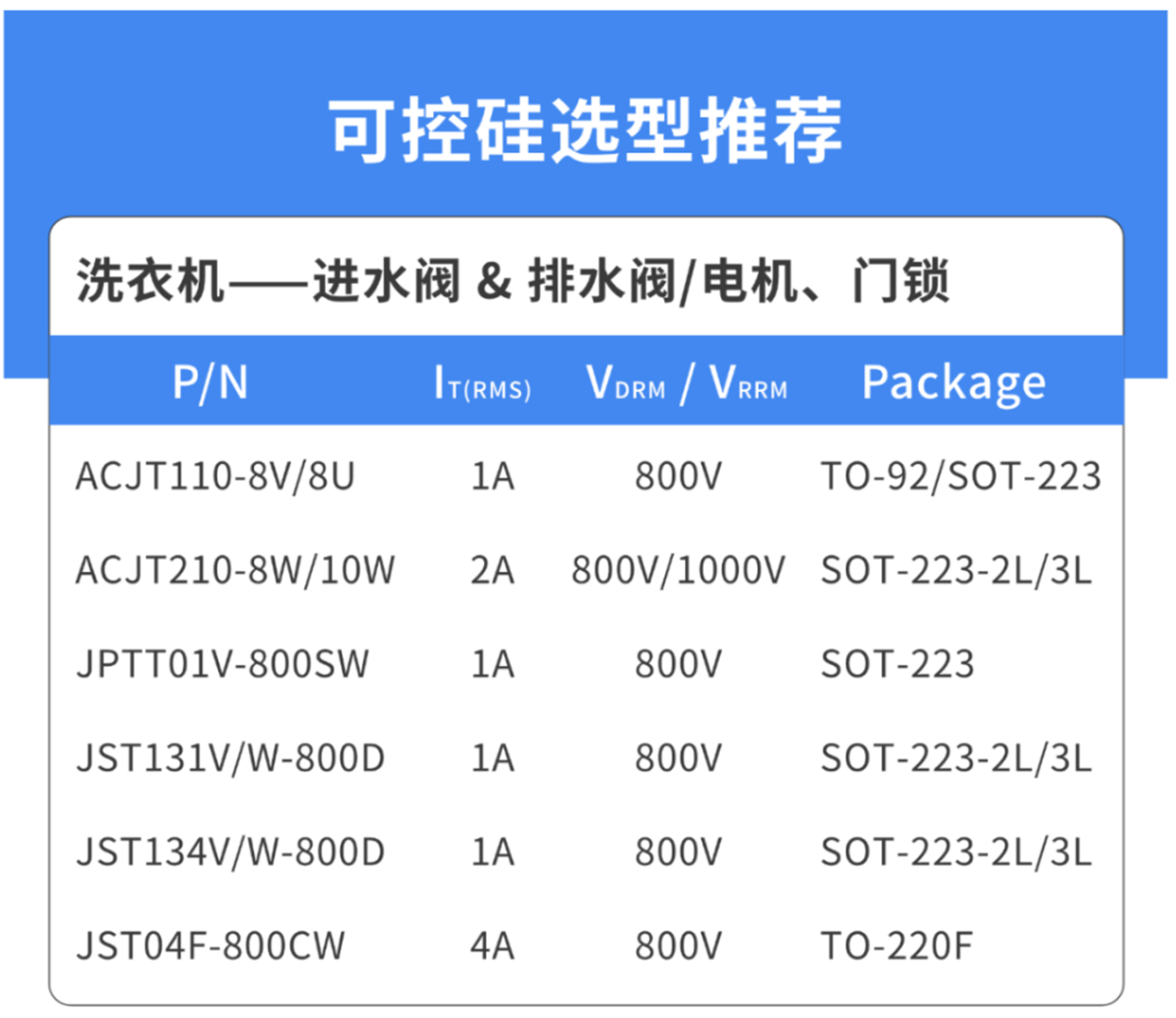 在洗衣机的电路系统中,可控硅是关键元件。CA88官网微电针对洗衣机不同控制负载的需求,提供了丰富的可控硅产品选择。在进水阀和排水阀(电机或泵)领域,JPTT01V – 800SW、JST131、JST134、ACJT210、JST04 等型号可控硅,以 1A、2A或4A 的电流和 800V 的耐压值,配合 TO – 92、SOT – 223、TO-220F 等封装形式,稳定控制水流进出。在电机正反转控制方面,T835H-8F、JST12X – 800CW 等 8A – 12A 大电流可控硅,确保电机强劲运转,适应各种电机功率。在滚筒洗衣机的门锁开关和加热环节,同样有适配的可控硅产品,保障洗衣过程的安全与高效。类比同行可控硅,CA88官网微电的可控硅抗雷击性能表现卓越,优于部分竞品,有效提升了洗衣机的稳定性和耐用性。